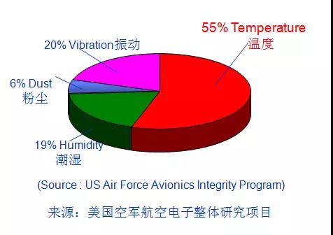 逆變器作為一款電力電子設(shè)備,和所有電子產(chǎn)品一樣都面臨溫度帶來(lái)的挑戰(zhàn),來(lái)自美國(guó)空軍航空電子整體研究項(xiàng)目的一份調(diào)查報(bào)告顯示(圖2):所有電子產(chǎn)品失效案例中,其中有高達(dá)55%的比例是溫度原因造成的。逆變器內(nèi)部的電子元器件對(duì)溫度同樣是非常敏感的,根據(jù)可靠性理論10度法則,從室溫起,溫度每升高10度,壽命減半,所以逆變器散熱設(shè)計(jì)非常重要。